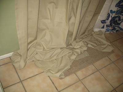 Once all of the popcorn has been removed (it took less than two hours for our 275 square feet), remove all of the drop cloths and all of the popcorn and dispose of them. You really can't be too careful with this junk, it's awful. And even if it doesn't have asbestos in it, it's messy as heck and you'd do better to get rid of it right away. Now you get to re-mask the room and hang new drop cloths. You needn't be as thorough this time, as you're just protecting your walls and carpet from the texture you'll apply to the ceiling. Here we are with the naked drywall showing through, and new masking hung (the drop cloths look used b/c I saved them from our last house painting projects - I'm cheap!)